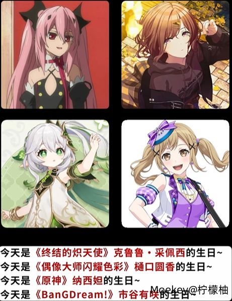 今天是克鲁鲁、圆香、纳西妲、市谷有咲的生日