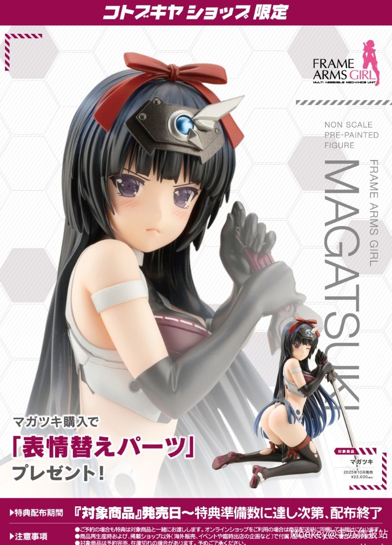 名称:フレームアームズ・ガール マガツキ 属性:女 、 比例人形 、 普通露出 全价:22,000日元 (含税,1093元) 出货日:2025年10月16日 比例:Non 制作:寿屋 作品:机甲少女 / FRAME ARMS GIRL 尺寸:高约158mm(含底座) 材质:pVC、ABS、磁铁、亚克力